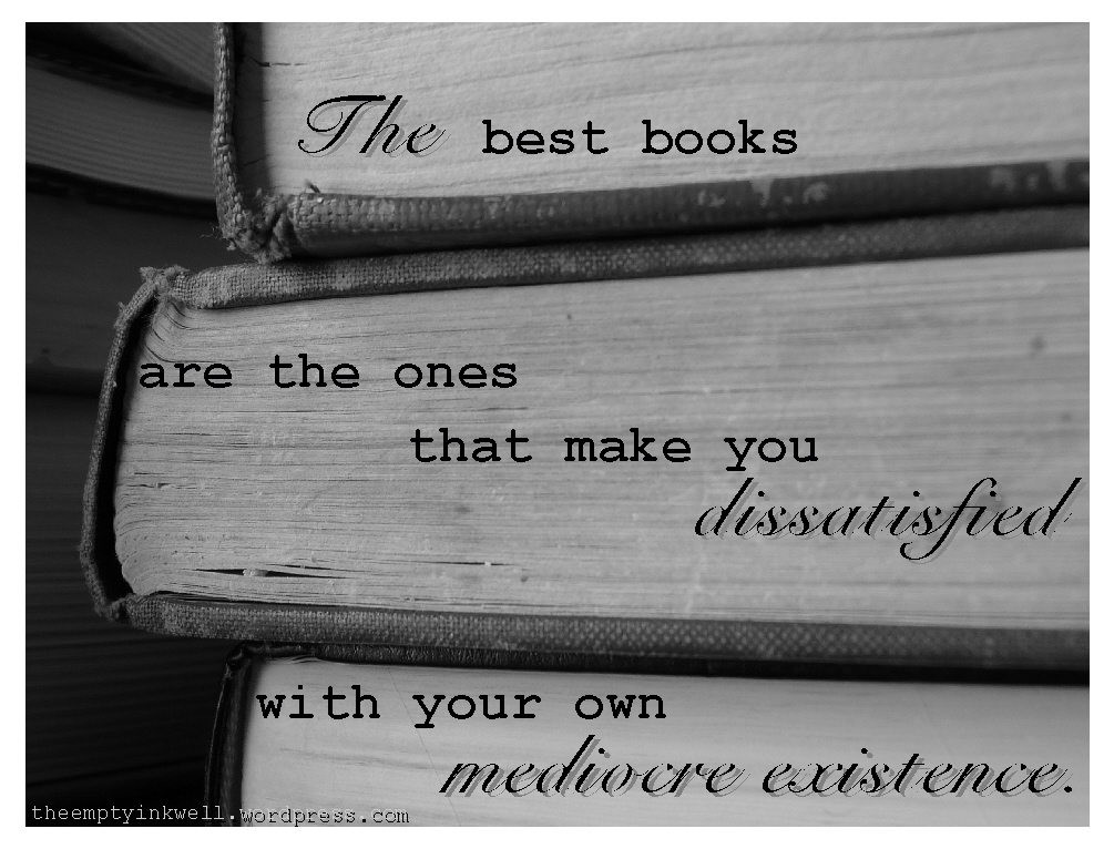 I like to say that the best books are the ones that make you dissatisfied with your own mediocre existence.